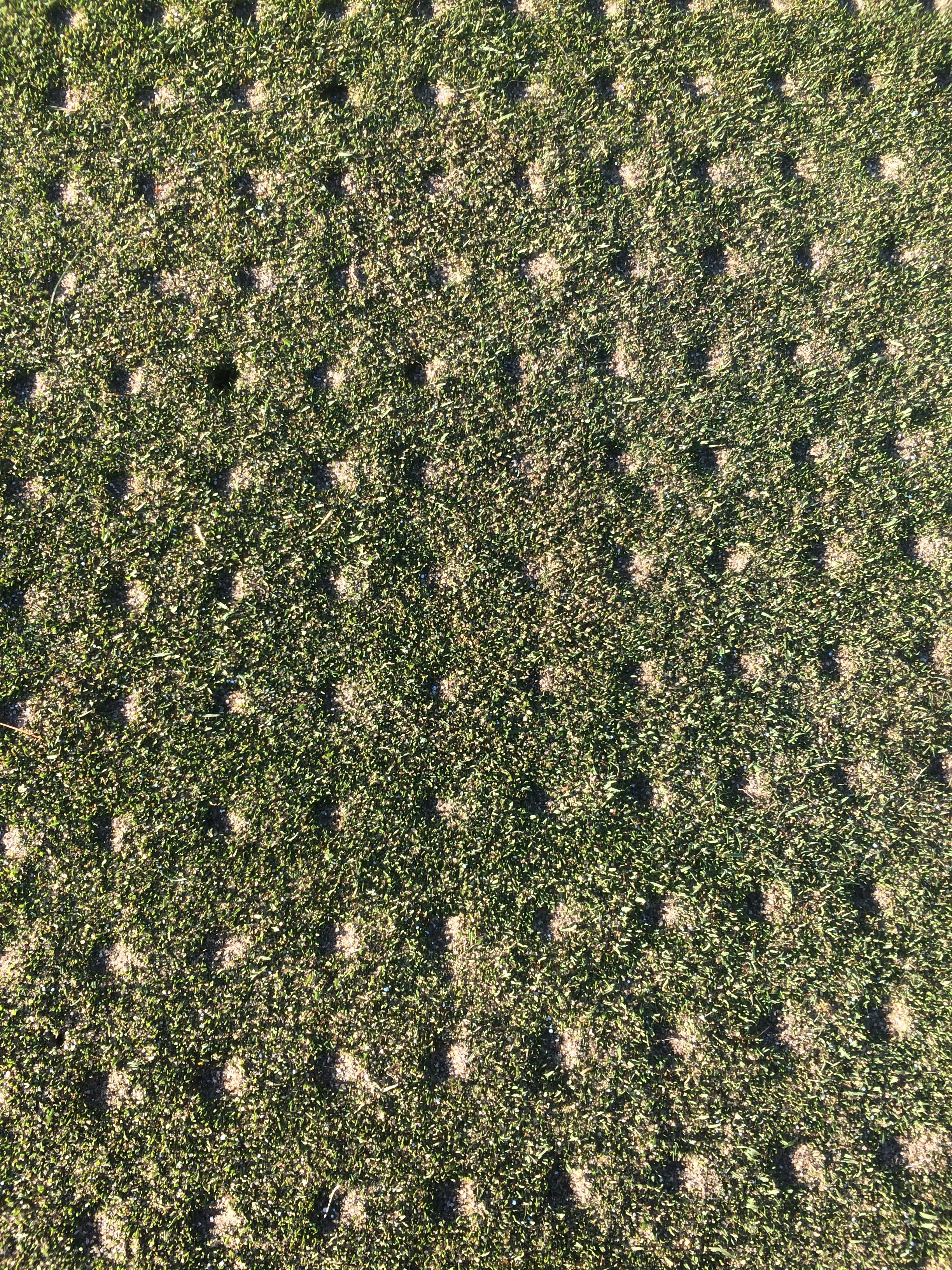 The greens are “healing” nicely. Mowing does not occur for approximently 7-10 days. It allows time for the turf to grow and any sand left on the surface can work its way into the soil profile.